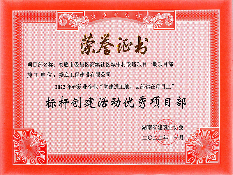 2022年婁底市婁星區高溪社區城中村改造項目標桿創建優秀項目部榮譽證書
