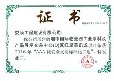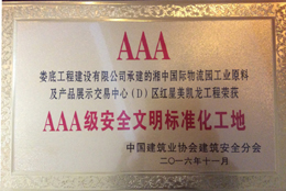 2016年11月23日,在安徽合肥舉行的中國建筑業(yè)協(xié)會安全分會2016年年會暨理事會上,我公司承建的湘中國際物流園工業(yè)原料及產(chǎn)品展示交易中心(D)區(qū)紅星美凱龍工程被評為AAA級安全文明標(biāo)準(zhǔn)化工地。這是我司繼2011年11月金谷建設(shè)小區(qū)8#、9#棟工程榮獲AAA級安全文明標(biāo)準(zhǔn)化工地后,又一次獲此殊榮。