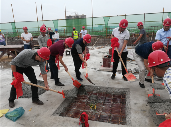 2018年5月23日,公司在江龍灘基地隆重舉行綜合樓主體封頂儀式。莊勝集團有限公司總裁周建和先生,湖南湘中礦業集團有限公司總裁楊克偉先生、副總裁劉璐先生親臨基地現場表示祝賀。公司高管在集團副總裁兼婁底工程建設有限公司董事長張愛慧先生的帶領下,共同揮鏟,為大樓主體封頂添上最后一斗混凝土。